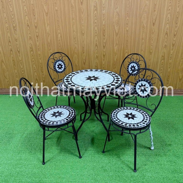 Điểm nhấn đặc biệt của bộ sản phẩm nằm ở mặt bàn và mặt ghế mosaic gốm sứ, được ghép thủ công tỉ mỉ với họa tiết hoa văn hình sao nổi bật. Màu sắc hài hòa, bề mặt nhẵn mịn, dễ dàng vệ sinh và giữ được vẻ đẹp bền lâu theo thời gian.