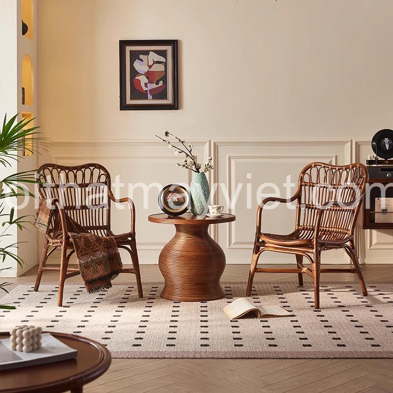 Mỗi bộ bàn ghế mây đều được nghệ nhân uốn nắn tỉ mỉ, giữ nguyên đường vân tự nhiên của mây, kết hợp cùng lớp sơn bóng bảo vệ bề mặt giúp sản phẩm chống ẩm mốc, hạn chế trầy xước và bền đẹp theo thời gian. Không chỉ có thiết kế thanh thoát, nhẹ nhàng, bàn ghế mây còn ghi điểm nhờ khả năng thông thoáng, dễ vệ sinh và phù hợp với khí hậu nhiệt đới.