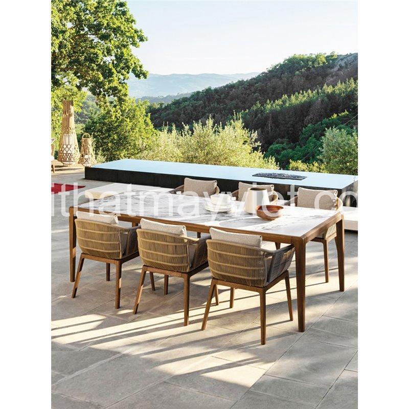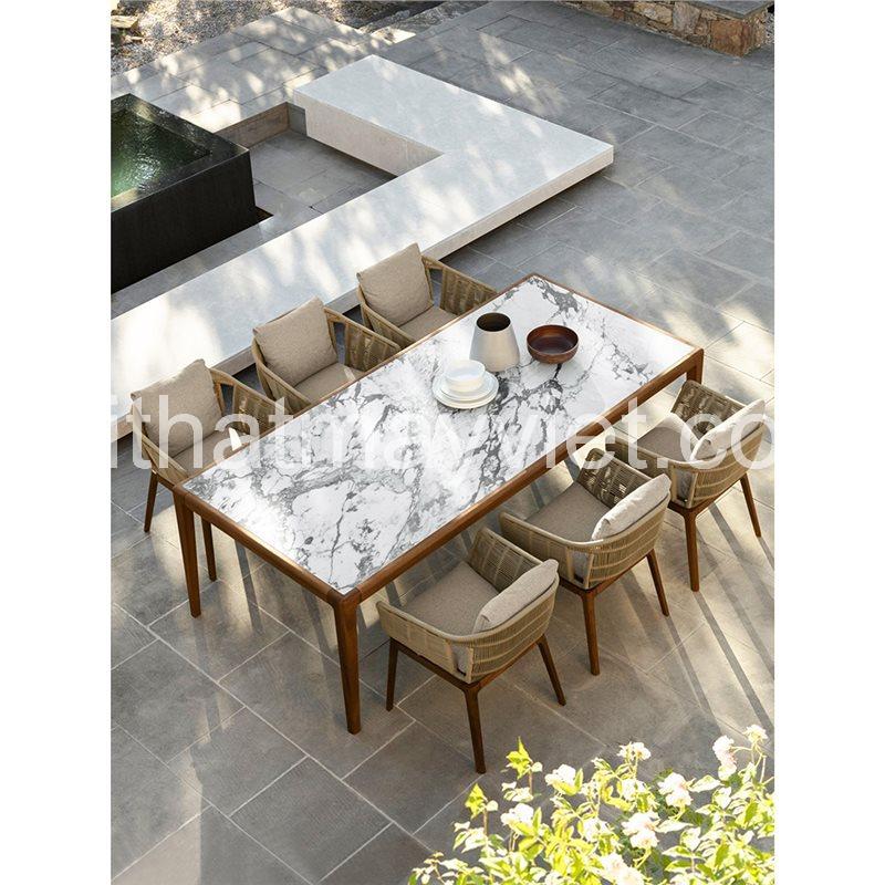 Khung bàn và ghế được làm từ gỗ tự nhiên đã qua xử lý, đảm bảo độ chắc chắn, hạn chế cong vênh và thích nghi tốt với điều kiện môi trường ngoài trời. Phần lưng và tay ghế sử dụng dây đan cao cấp, đan thủ công tỉ mỉ, mang lại độ đàn hồi tốt, thoáng khí và cảm giác ngồi thoải mái. Mặt bàn được hoàn thiện bằng đá vân marble sang trọng, không chỉ tạo điểm nhấn thẩm mỹ mà còn có khả năng chống thấm, dễ lau chùi và vệ sinh, phù hợp cho các bữa ăn hay buổi tụ họp ngoài trời.