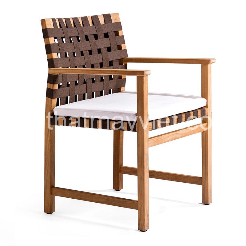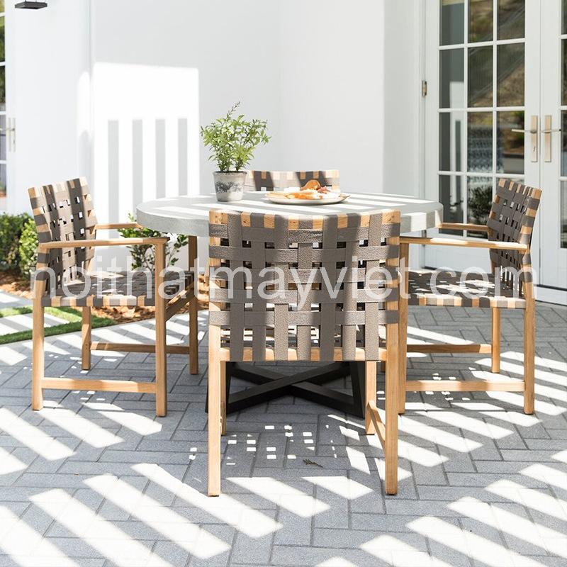 Bộ bàn ghế ngoài trời với thiết kế hiện đại từ khung gỗ sồi tự nhiên kết hợp dây dù bản to đan thủ công đang trở thành lựa chọn lý tưởng cho các khu vực sân vườn, ban công, nhà hàng – resort cao cấp. Sản phẩm vừa mang vẻ đẹp mộc mạc của gỗ tự nhiên, vừa toát lên sự chắc chắn và tinh tế trong từng đường đan.