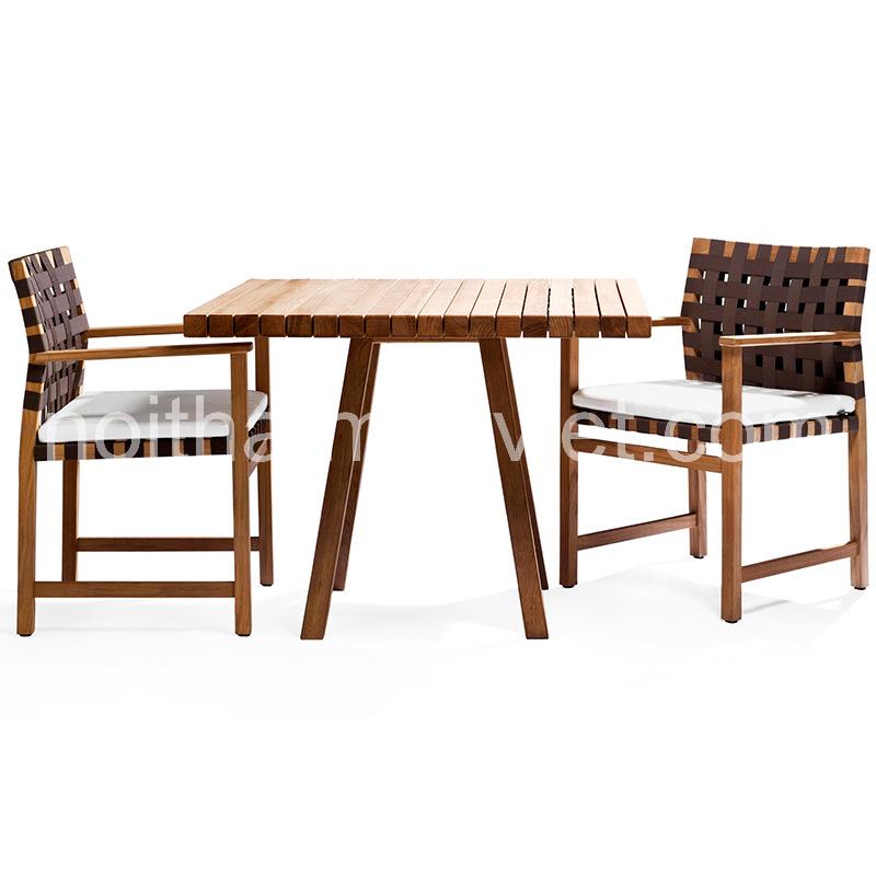 Bộ bàn ghế sở hữu kiểu dáng đơn giản nhưng tinh tế, đường nét vuông vắn, thanh thoát. Bàn có kích thước vừa phải, phù hợp cho bữa ăn gia đình, tiệc nhẹ ngoài trời hay không gian café – sân thượng. Ghế ngồi thoải mái, có hai phiên bản ghế đơn và ghế có tay vịn, đáp ứng nhu cầu sử dụng đa dạng.