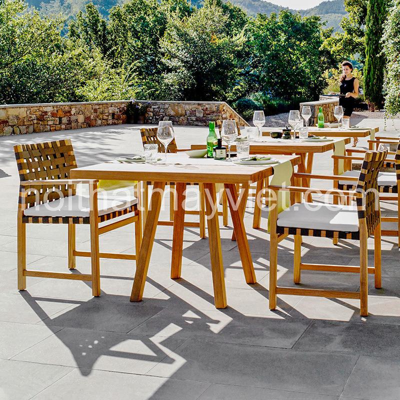 Khung ghế và bàn được chế tác từ gỗ sồi nhập khẩu, nổi tiếng với khả năng chịu lực tốt, hạn chế cong vênh và độ bền vượt trội trong điều kiện ngoài trời. Tông gỗ sáng tự nhiên giúp không gian trở nên sang trọng, hài hòa và gần gũi với thiên nhiên.