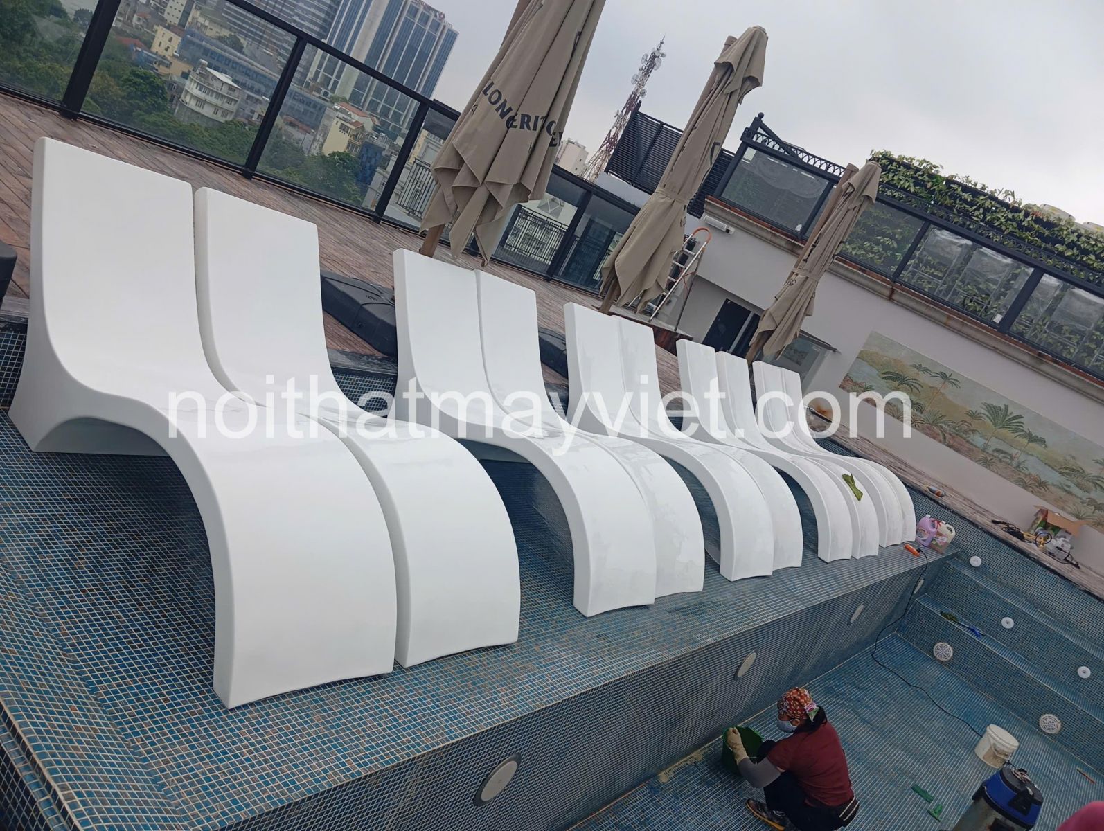 Hình ảnh cho thấy dòng ghế hồ bơi cao cấp được thiết kế theo kiểu dáng cong mềm mại, tạo điểm nhấn hiện đại và tinh tế cho không gian rooftop.