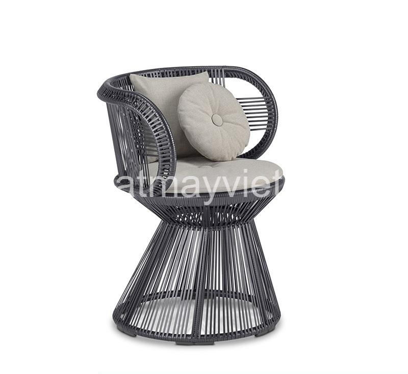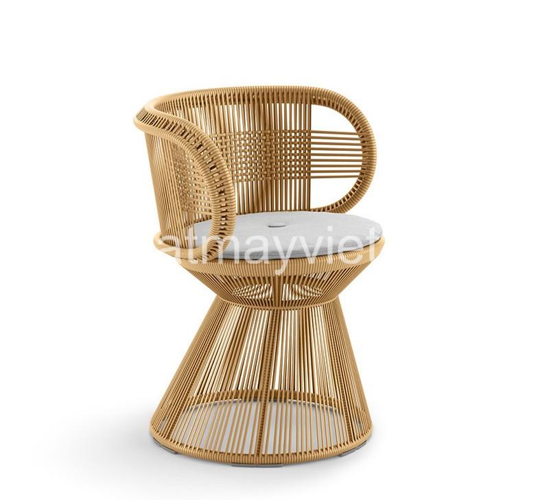 Sản phẩm được thiết kế với phần khung đan chắc chắn từ các sợi giả mây/nhựa cao cấp tông màu tự nhiên, tạo nên vẻ đẹp mộc mạc nhưng không kém phần hiện đại. Các nan đan thẳng đều, mềm mại ôm trọn form ghế, mang lại cảm giác thông thoáng và thoải mái khi sử dụng.